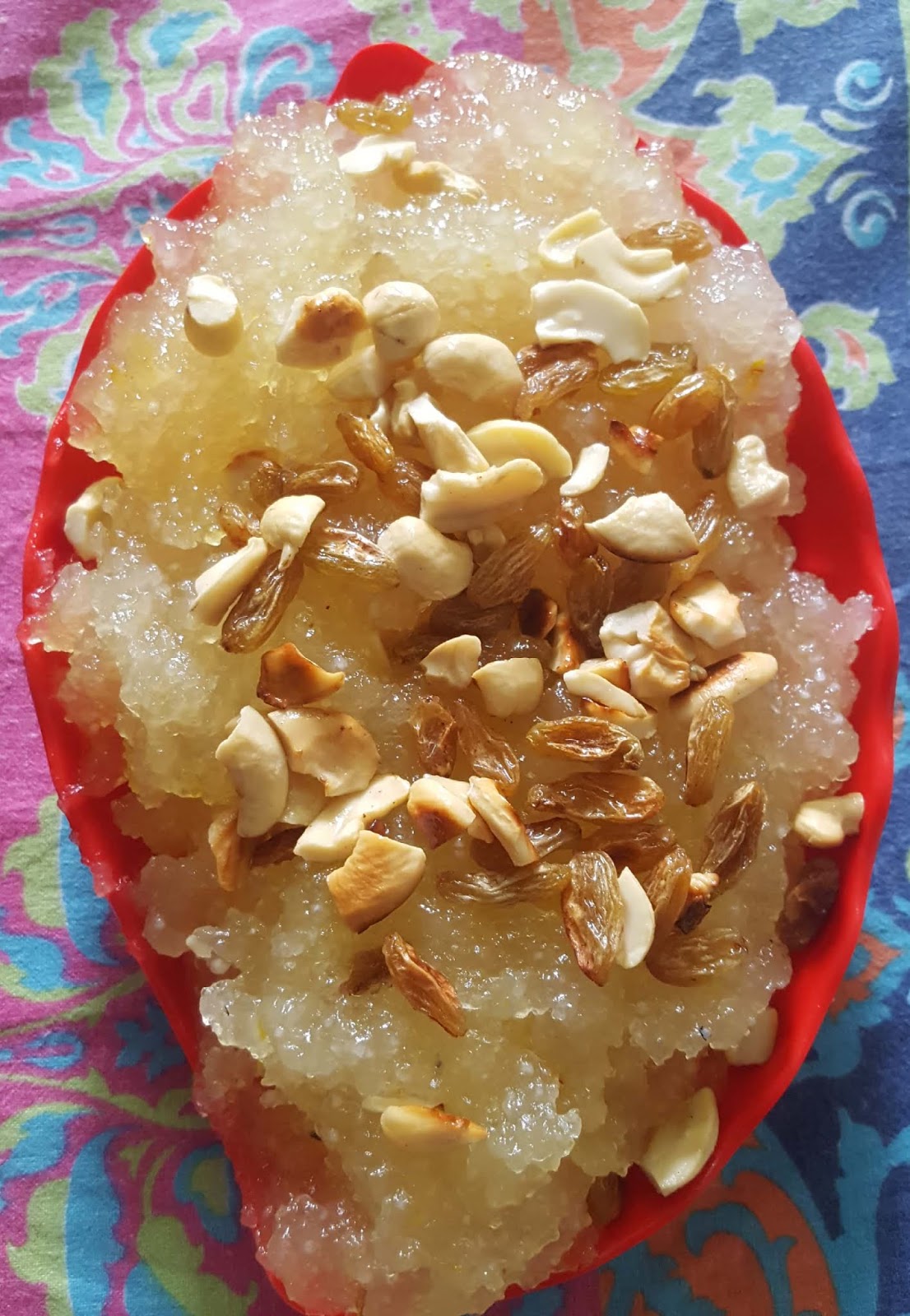 2. And add sagu powder in that till it gets cooked , then add ghee and sugar to it till all gets mixed and cooked.
